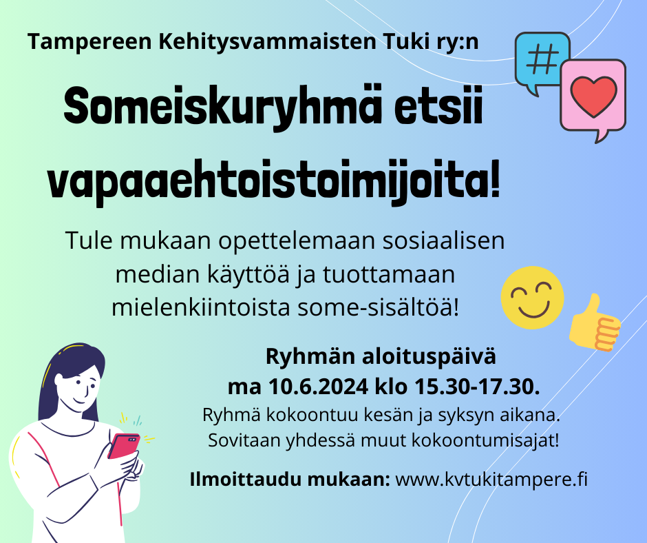 Tukiyhdistyksen uusi Someiskuryhmä etsii vapaaehtoistoimijoita tutustumaan erilaisten sosiaalisen median alustojen käyttöön sekä tuottamaan kulttuuriin ja yhdenvertaiseen harrastamiseen liittyvää sisältöä someen!